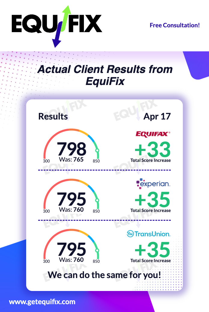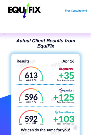 "I have never worked with such a dedicated and efficient company before! Andrae really went above and beyond to give me my best chance at a new start. A clean slate mixed with a type of professionalism you just don’t find these days. I would highly suggest only trusting Equifix with any credit needs. Let them give you your life back!"